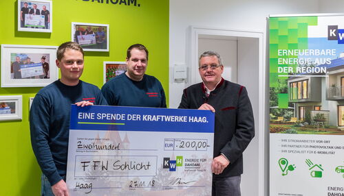 Die Kraftwerke Haag spenden 200,- Euro an die Feuerwehr Schlicht um deren Jugendarbeit zu unterstützen.